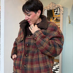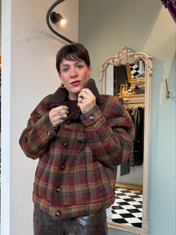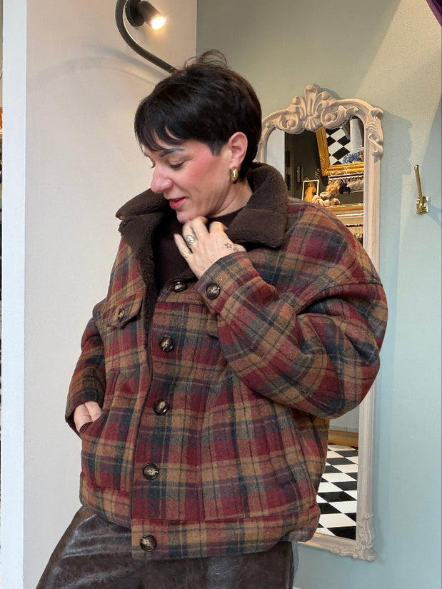 Cappottino con interno in eco pelliccia, fantasia a quadri. Tasche laterali e tasche frontali in alto. Bottoni come chiusura frontali e bottone sul polso. 100% poliestere