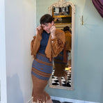 Gonna sirena in misto lana con elastico in vita e frange sul fondo. Presenza fantasia blu, color mattone e lurex rame. Texure traforato.