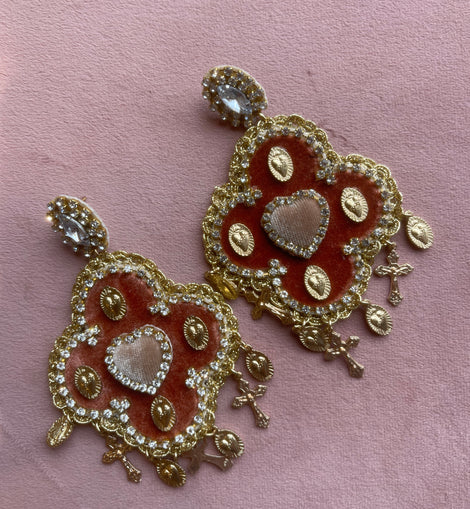 La base è impreziosita da velluto color rame, cuore centrale e da una cornice scintillante, mentre il bordo inferiore è decorato con piccoli charm dorati a forma di croci e cuori sacri che donano movimento e luce.