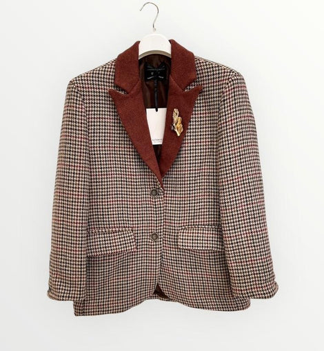 Giacca oversize pied de poule sui toni del marrone terracotta e bordeaux. Bottoni sui polsi. collo revers. Spilla sul collo. 100% poliestere