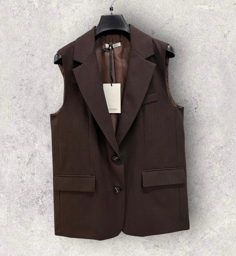 Blazer in visto viscosa, lunghezza midi, due bottoni come chiusura sul davanti, vestibilità over.