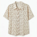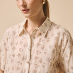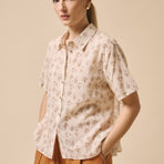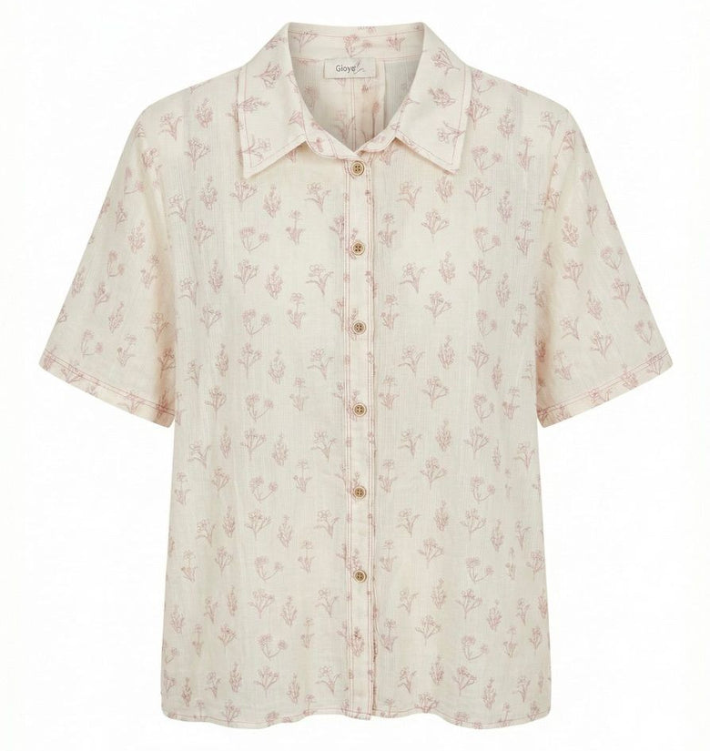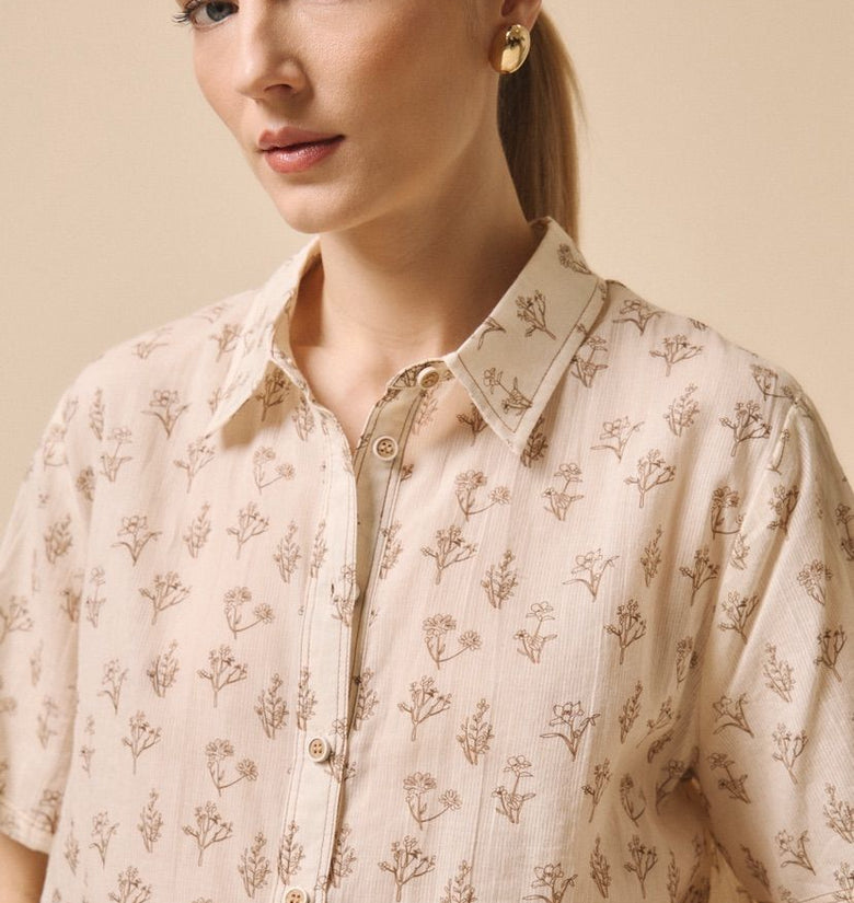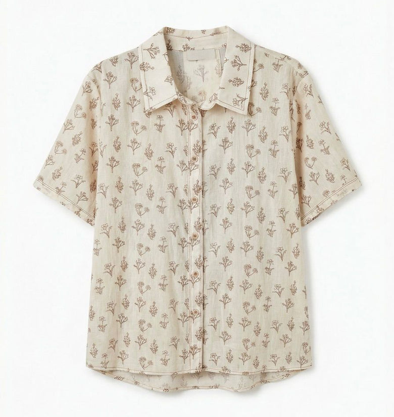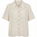 Blusa in 100% cotone, collo a camicia, bottoni sul davanti, manica corta. Veste dalla 40 alla 44, taglia unica