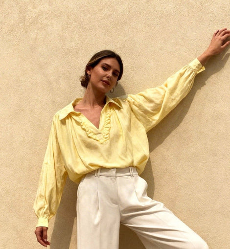 Blusa donna color giallo, vestibilità over. Colletto a camicia, scavata a V sul davanti. Polsini con bottone. Taglia unica.