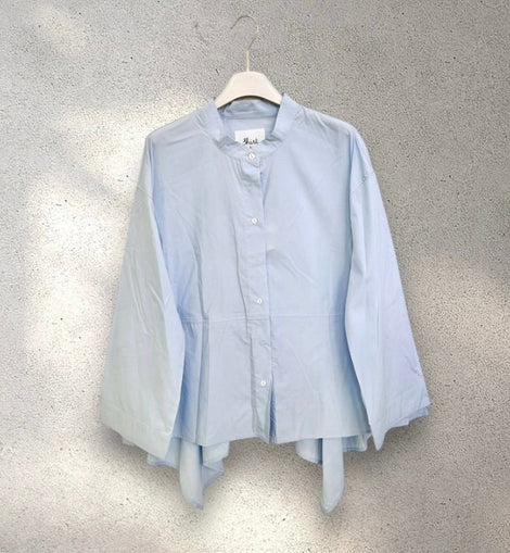 Camicia LOREL donna azzurra , stile minimal, manica lunga, bottoni sul dabanti, collo alla coreana. Presenta punte assimmetriche sul retro nel fondo della camicia.55% lyocell 45% cotone