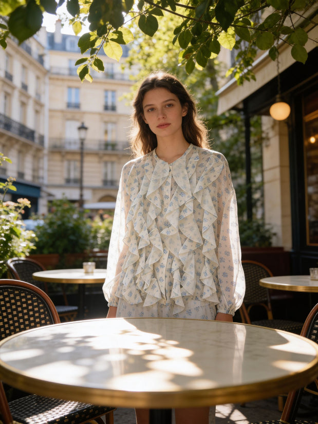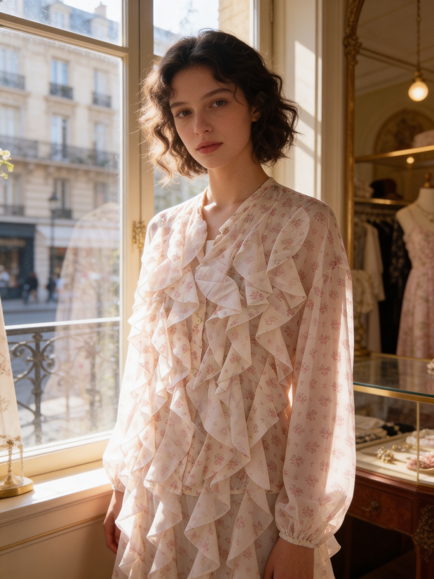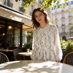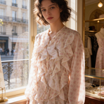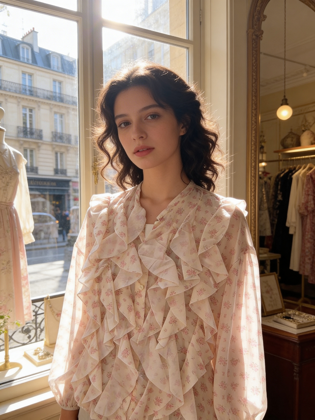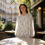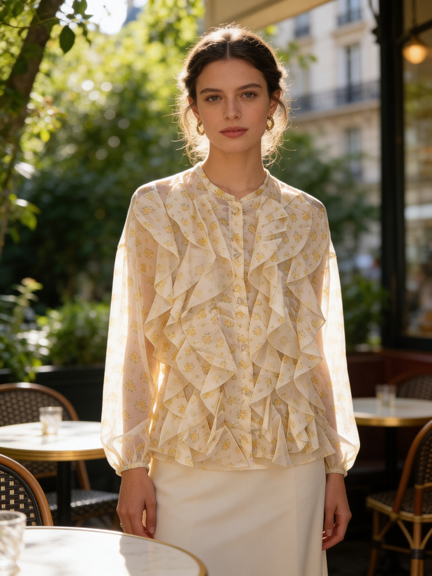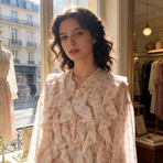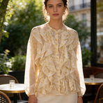 Camicia donna, collo alla coreana, bottoni sul davanti, frappe e fantasia fiorellini. taglia unica 85% lyocel 15% poliestere
