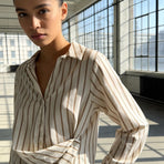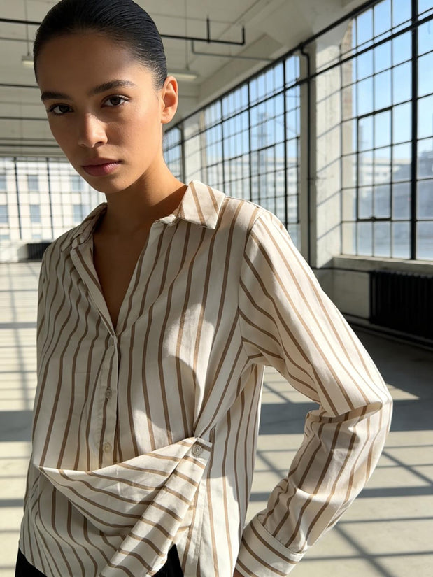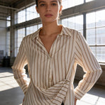 Camicia donna in cotone panna a righe marroni , colletto a punta. Polsini con bottone. Abbottonatura sul davanti, fino a metà e drappeggio da una parte con bottone laterale.