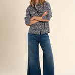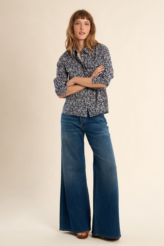 Camicia donna in cotone stampato, micro fantasia con fiorellini. -Maniche lunghe, polsini con bottoni -Colletto a camicia -Chiusura frontale con bottoni su tutta la lunghezza -Tasche con patta e bottone sul petto -Vestibilità dritta ,