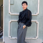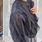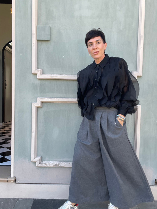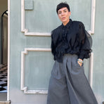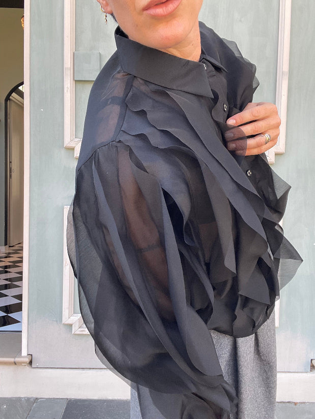 Camicia molto voluminosa con frappe sul davanti. Bottoni ricoperti. Taglio crop.