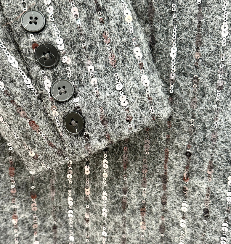 cappotto in misto lana, con dettagli glitter. chiusura doppiopetto con bottoni neri. spacco sul retro.