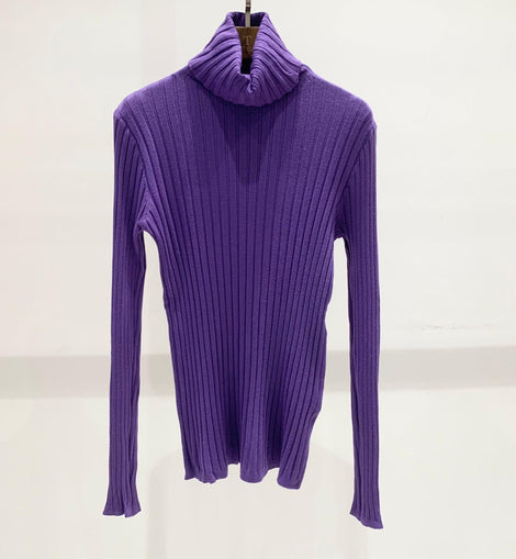 Dolcevita a coste larghe, collo alto, vestibilità aderente.