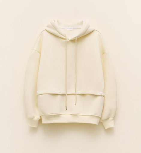 Felpa donna color panna realizzata in misto cotone.Cappuccio e coulisse regolabile.Dettaglio applicazione bottoni.Interno felpato e polsini alle maniche.Vestibilità oversize, disponibile in taglia UNICA.