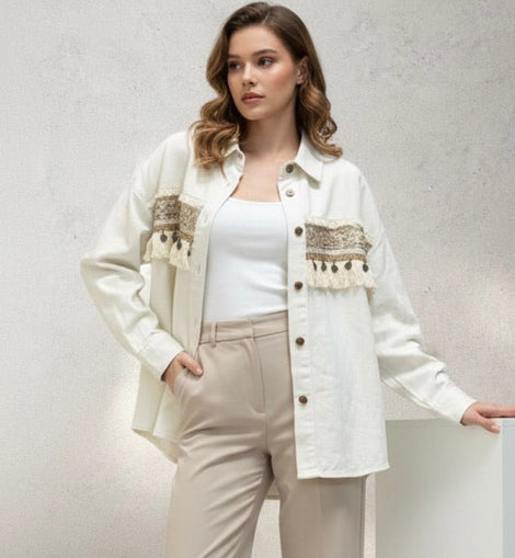 Giacca camicia donna color bianco in stile boho. passamaneria davanti e dietro con medaglie e frange. 90% COTTON+10% POLYESTER