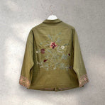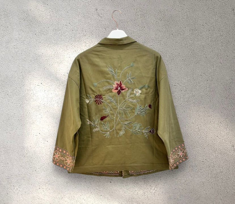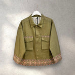 Giacca camicia donna color verde con ricamo boho oro e rosa. Taglia unica, vestibilità over