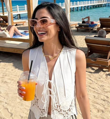Gilet Isla color bianco con pizzo macramè sul fondo. Chiusura con laccia sul davanti. taglia unica. 100% cotone