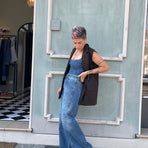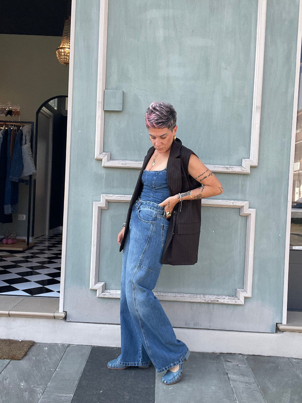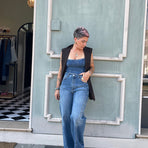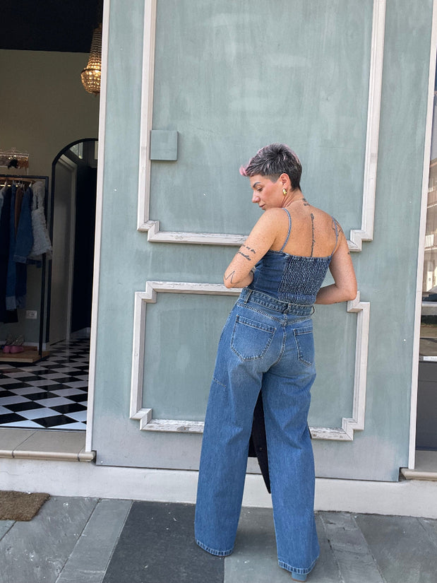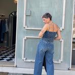 jeans a vita alta con bottone e zip, vestibilità regolare. Cucitura sul davanti, gamba lenta.