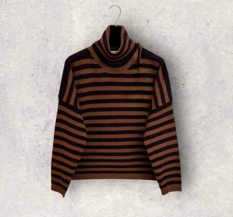 Maglione donna a collo alto don righe orizzontali e spalla scesa. vestibilità dalla 40 alla 48 - 100% lana merinos