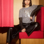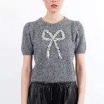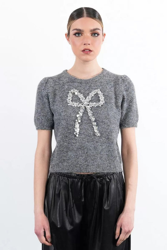 "-Maglione lavorato a maglia -Maniche corte con leggero palloncino -Scollo rotondo -Fiocco decorativo di paillettes al centro davanti -Vestibilità dritta