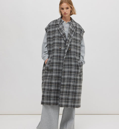 Maxi gilet super over a quadri si toni grigio e nero. Bottoni frontali, tasche laterali. vestibilità over da una 40 ad una 50. Tasche laterali e interno trapuntato. 100% poliestere