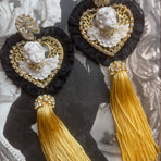 La frangia lunga in fili dorati dona movimento e luce, trasformandoli in un accessorio unico e scenografico.