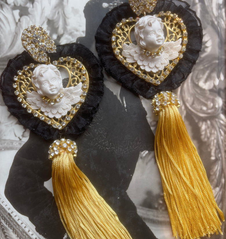Il design a cuore in tessuto nero è arricchito da un raffinato cammeo con angelo bianco centrale, incorniciato da dettagli luminosi in strass.