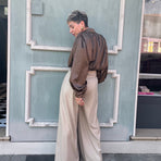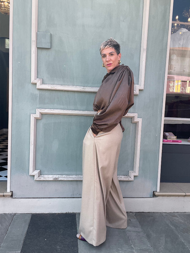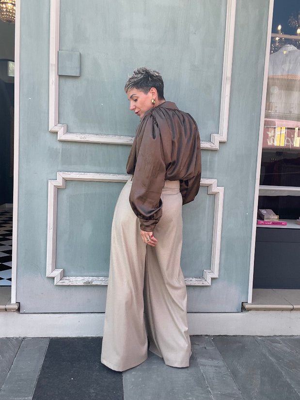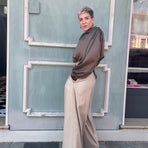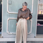 Pantalone vita alta con pences sul davanti, e tasche laterali. Chiusura con zip e bottoni. 65% poliestere 33% viscosa 2% elastan