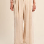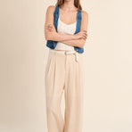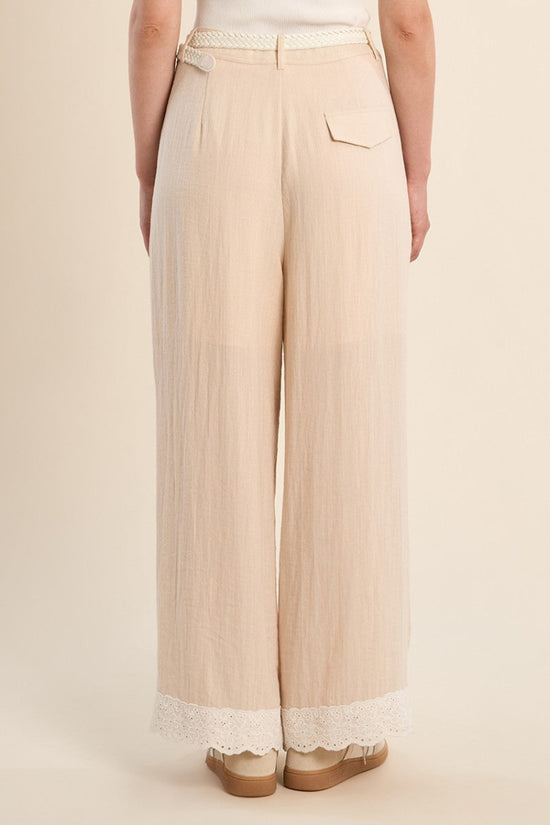 Pantaloni da donna, dritti a vita alta, dettagli in pizzo -Gambe larghe, pizzo sul fondo dei pantaloni -Chiusura con cerniera e bottone -Cintura intrecciata, rimovibile.