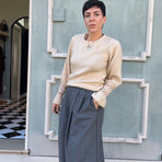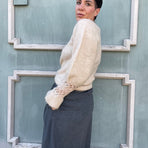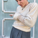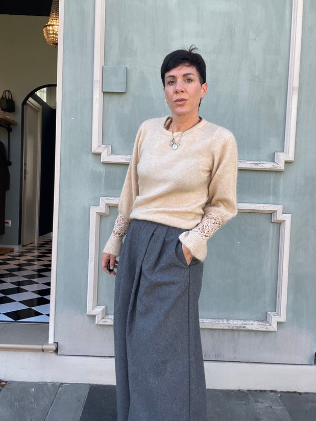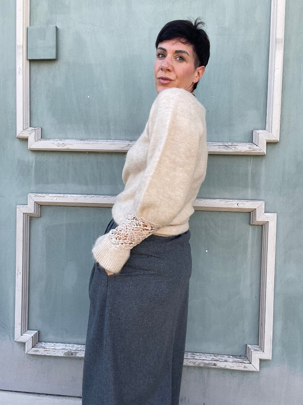 Pullover girocollo in misto lana e mohair, manica con dettagli in pizzo, fine manica a tulipano. 18%mohair 18% lana 16%acrilico 43% poliestere 5% elastan