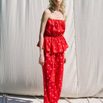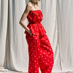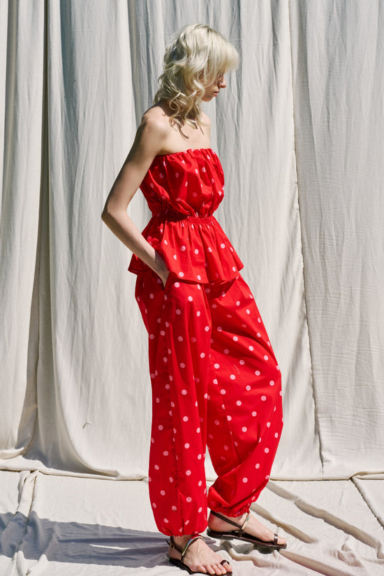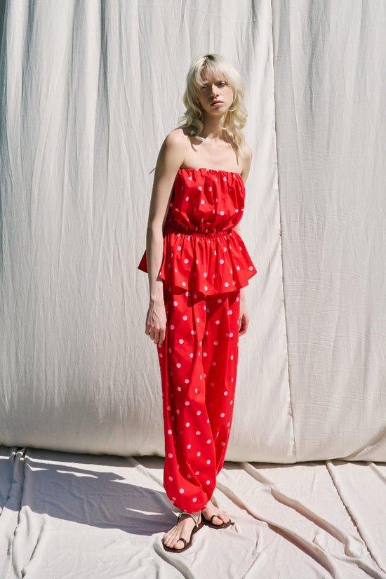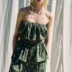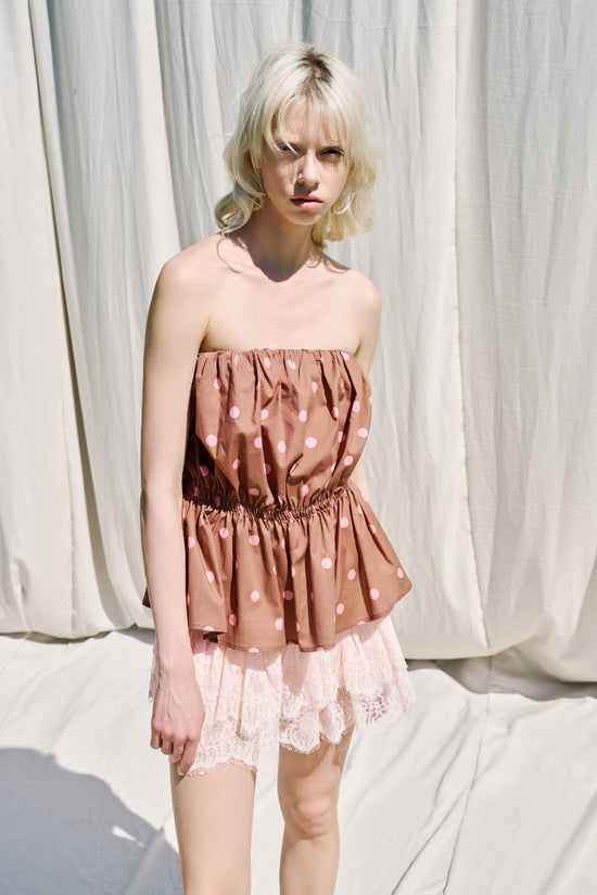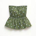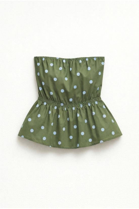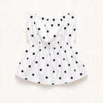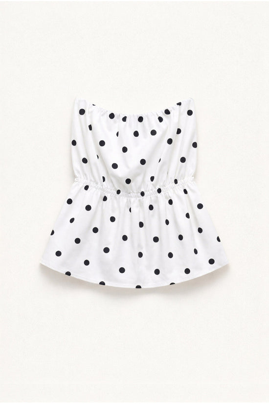 Top donna in misto cotone con stampa a pois.Scollo off shoulder elasticizzato e arricciato.Balza sul fondo effetto svasato.Vestibilità regolare, disponibile in taglia S/M, M/L.